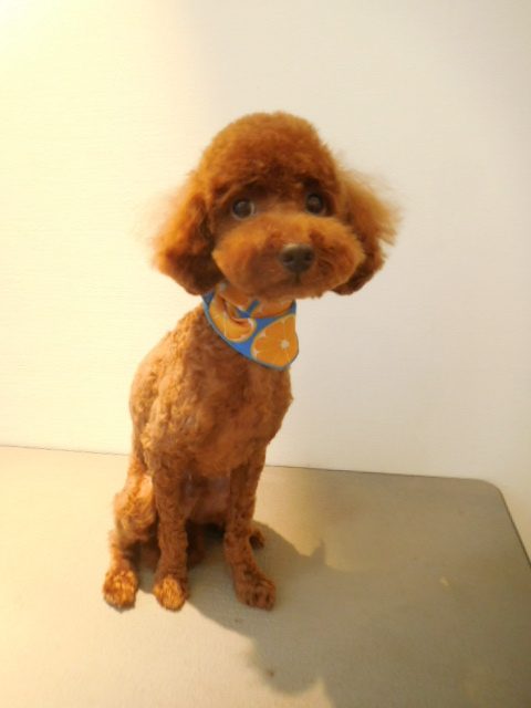 お顔は涙焼けがあるので今回プードルのラムカットのようなスタイルにイメチェンしました。尻尾は毛玉のため短く耳も顎ラインで揃えました。